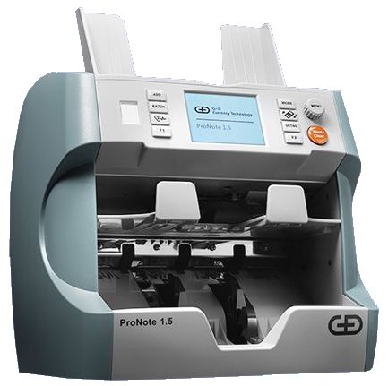in sumljivi bankovci se med procesom štetja izločijo v predal za zavrnjene bankovce, kar omogoča dodatno varnost in neprekinjeno štetje. Aparat je možno hitro in enostavno posodobiti na nove bankovce. ProNote 1.5 izpolnjuje trenutne zahteve kombinirano s svojo majhnostjo – to je najbolj kompakten aparat v svojem razredu. Edinstvena funkcija: enostavno upravljanje in nastavitev vmesnika s tipko Jog-Dial.